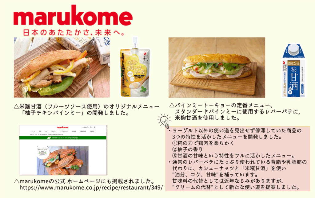 米糀甘酒の特性を活用し、油分、コク、甘味を補う新しい使い方を開発しました。これにより、米糀甘酒は料理全般において、風味を豊かにしながらもヘルシーな選択肢として幅広く利用できることを提案しました。