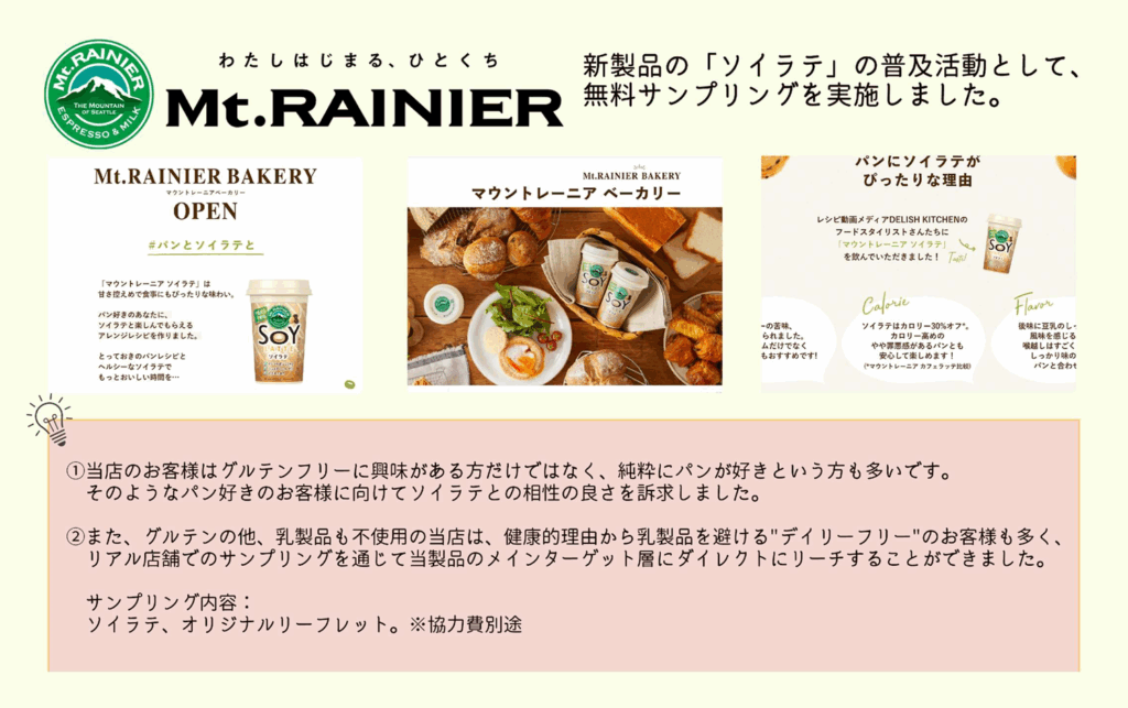 森永乳業様マウントレーニア無料サンプリング対応 2021年6月19日 経営していたグルテンフリー専門店「バインミートーキョー」(外苑前)にて、森永乳業様のマウントレーニアを米粉パンとの相性が良いものとして、より広い層へ訴求するために無料サンプリングを実施。